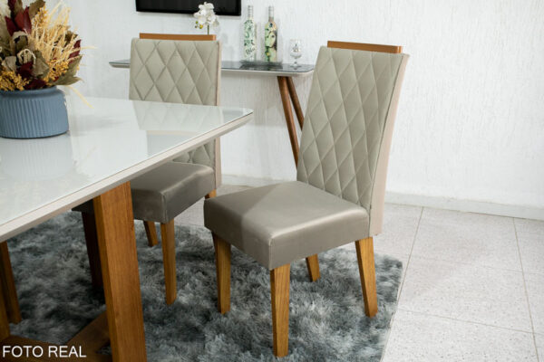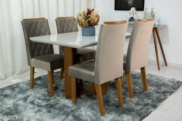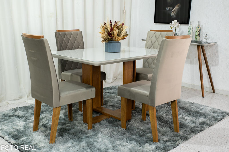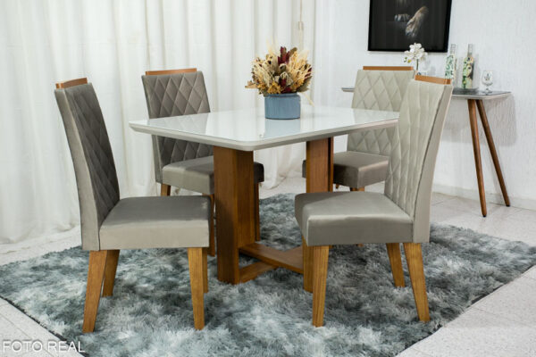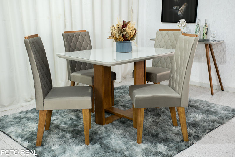 Mesa de Jantar Elenor Tampo Vidro Off c/4 Cadeiras Iza Mel Veludo Perola – VIERO