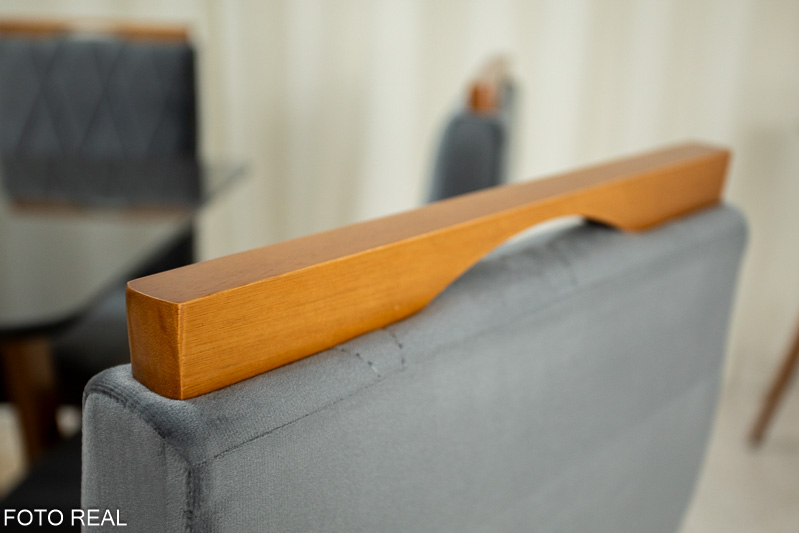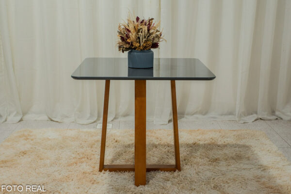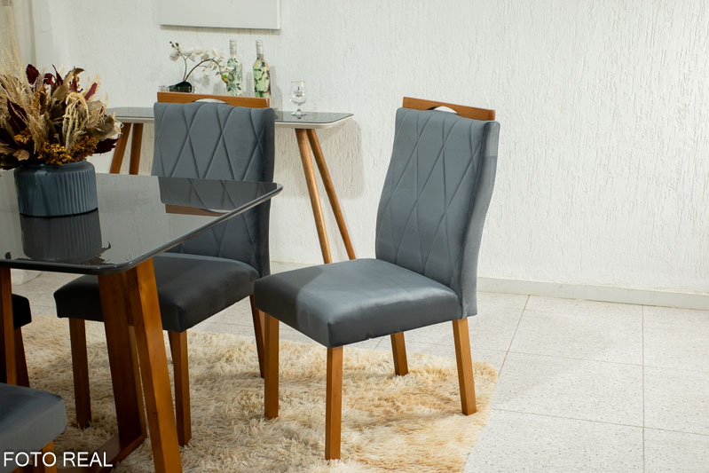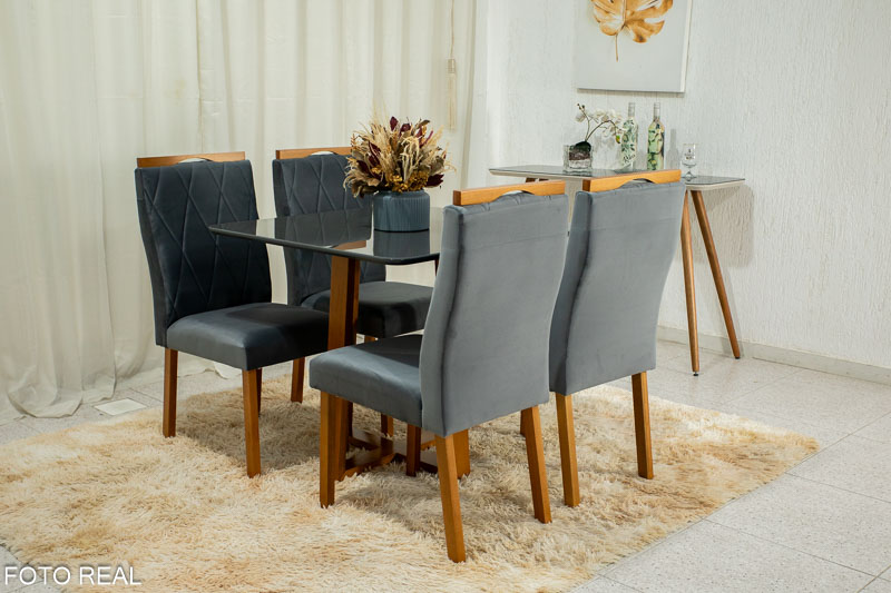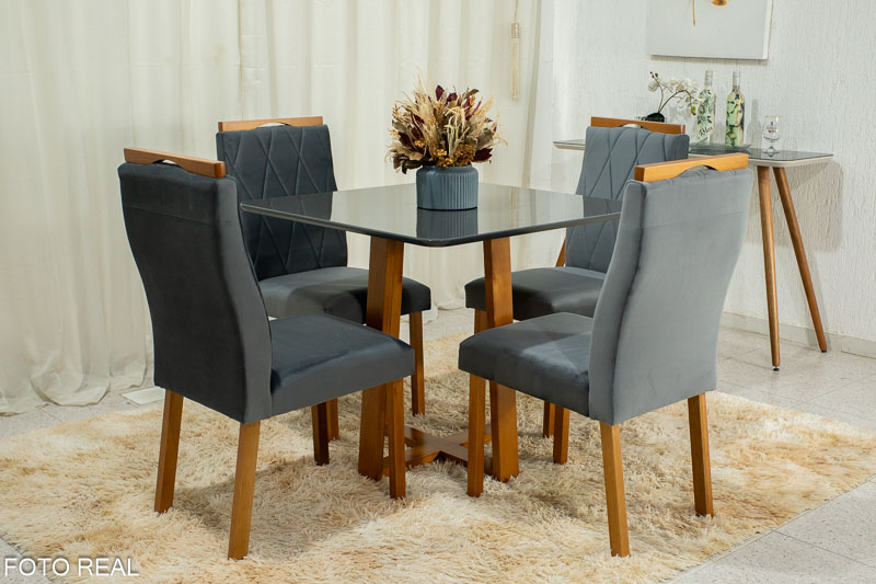 Mesa de Jantar Pedro Mel Tampo Vidro Grafite 90×90 4 Cadeiras Lisboa Veludo Grafite Art Assento – Madeira Maciça