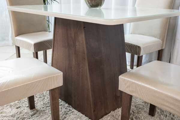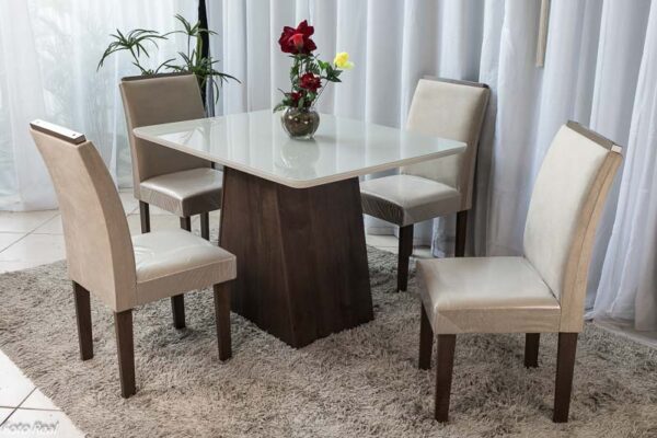 Mesa de Jantar Servilha 120×90 Chocolate Vidro off 4 Cadeiras Sued Bege