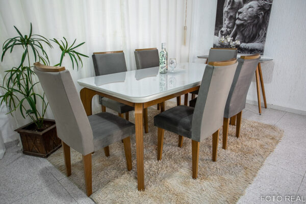 Mesa Londrina possui tampo de MDF com vidro na cor Off, medindo 180×90 cm, seis cadeiras estofadas em veludo grafite. Essa combinação perfeita traz elegância, segurança e conforto para sua sala de jantar. Adquira agora mesmo essa opção incrível para momentos especiais com amigos e familiares.