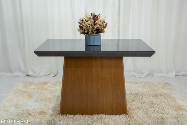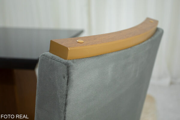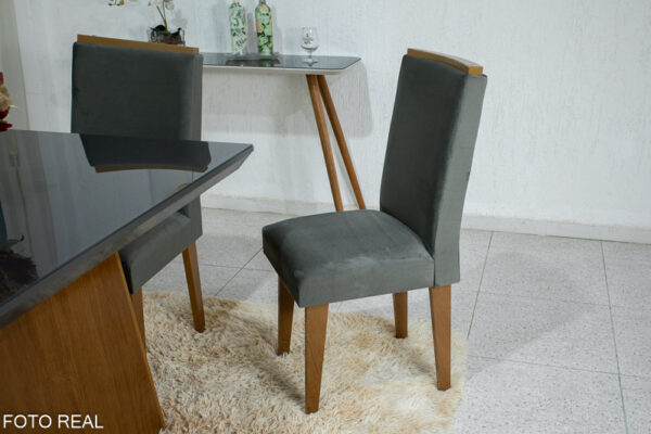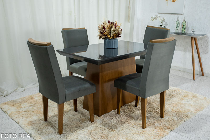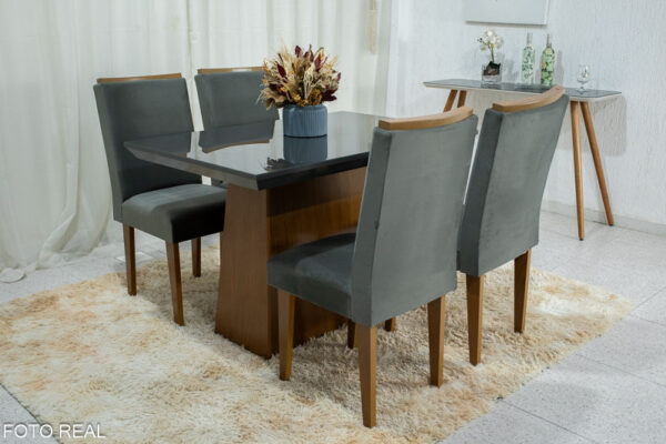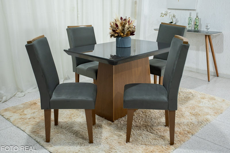 Mesa Jantar Luna Imbuia Tampo Vidro Grafite 120×80 4 Cadeiras Lunara Veludo Grafite Rufato