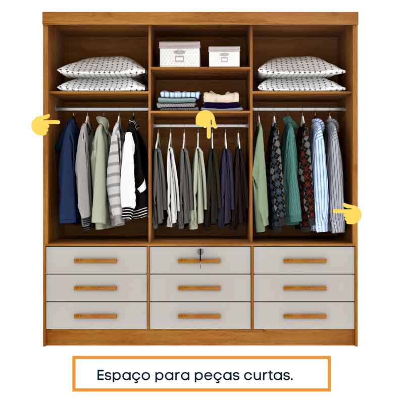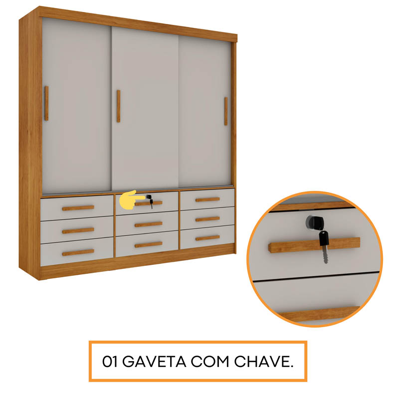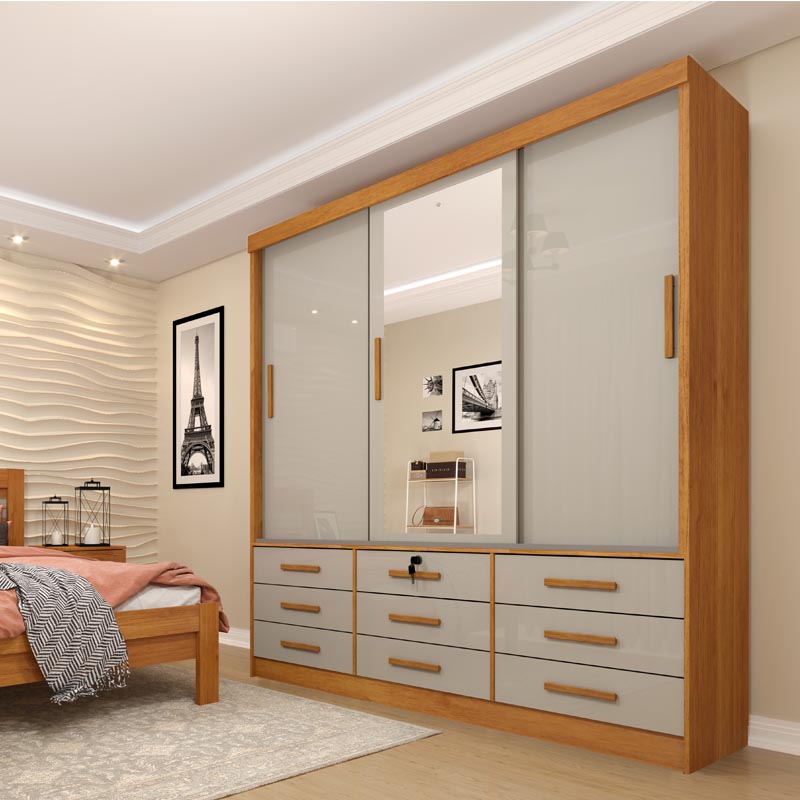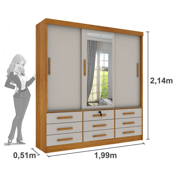 Roupeiro Chicago Larg. 1.99m 3 Portas c/Espelho Cinamomo/Off Tcil