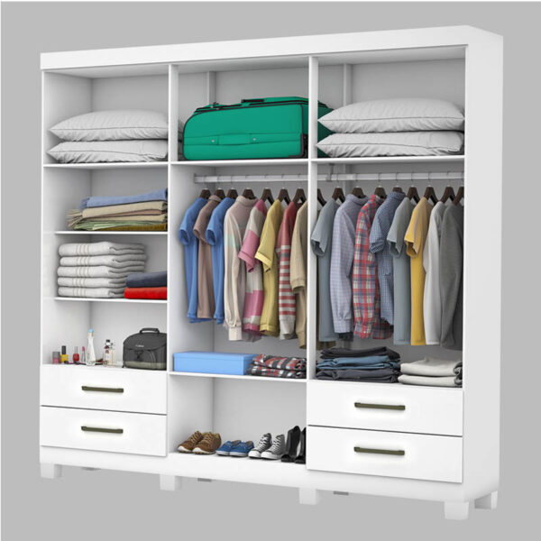 - Diferencial: Roupeiro com pés, cabideiros em alumínio e quatro gavetas com corrediças metálicas.