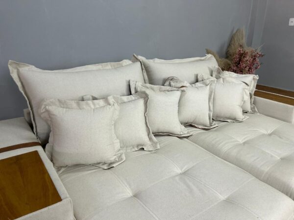 Todo revestido em linho, com detalhes em couro.
